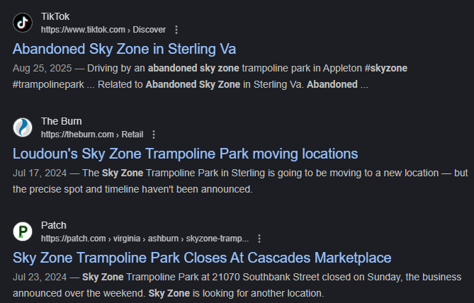 So, I searched up “abandoned skyzone NOVA”. I immediately got these results:
