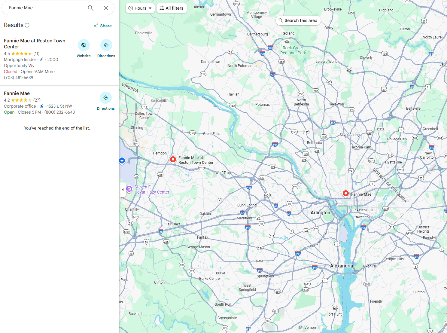There are only two locations in the Washington D.C. area, but only one of them is in Northern Virginia. It is in a town called “Reston”. Sounds like the town for the second part! Let’s double check: